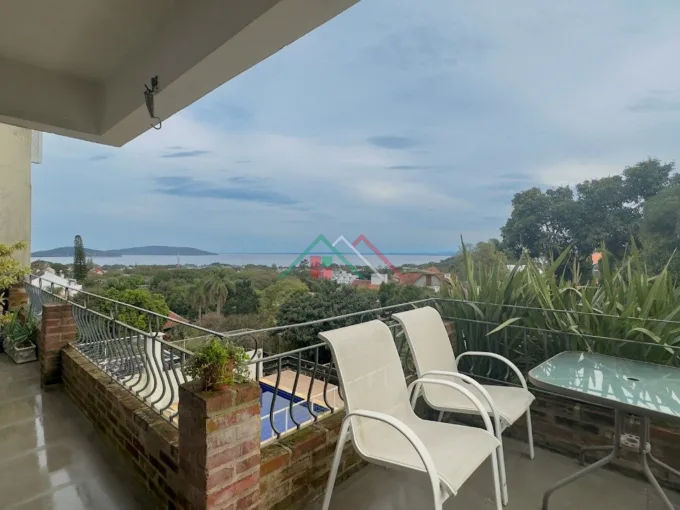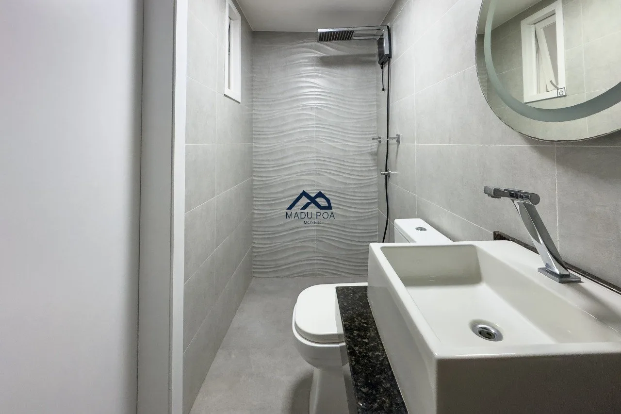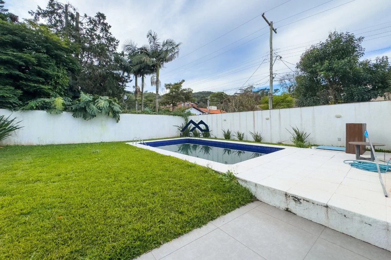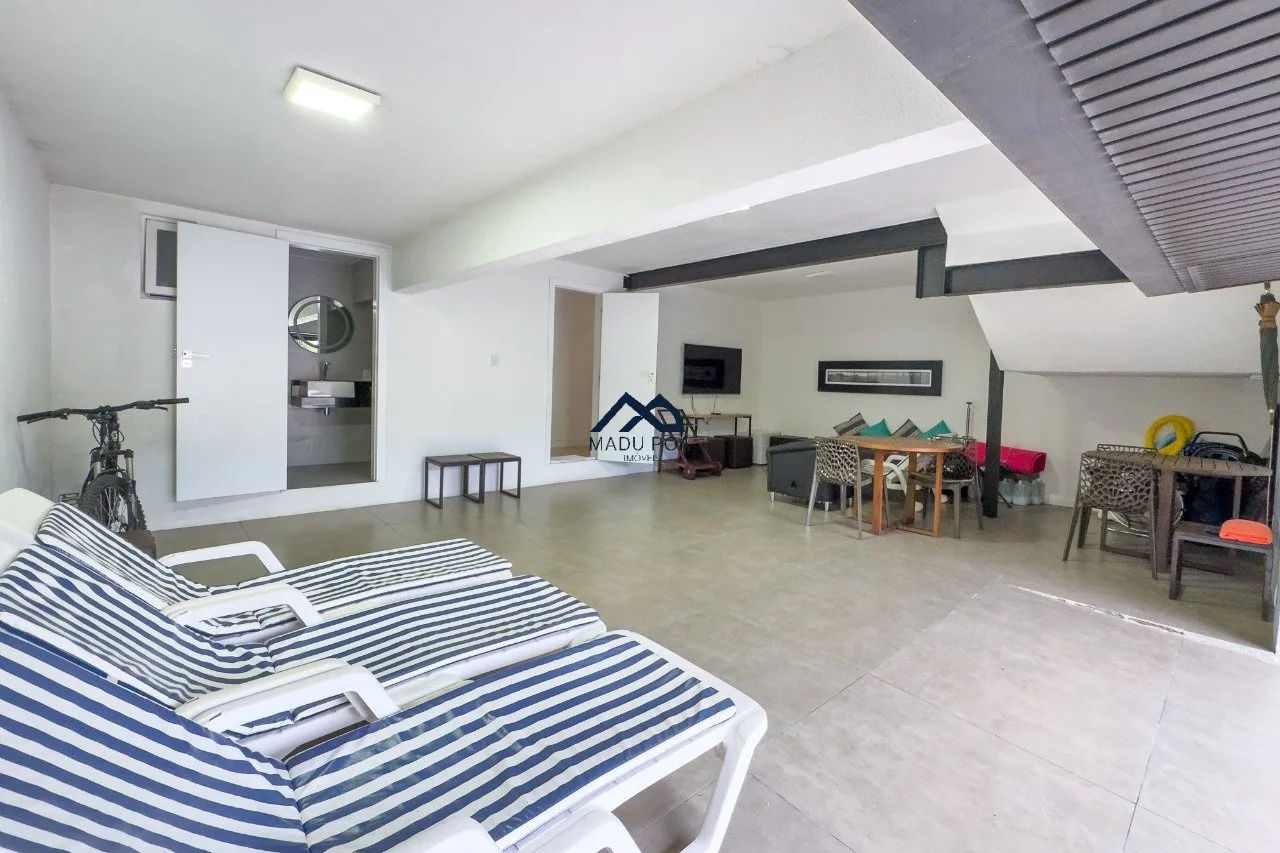 No térreo encontra-se a piscina junto a um belo gramado e garagem com 04 vagas, um banheiro que atende essa área de lazer e uma saleta com televisão que integra esse recanto, além de acesso a copa/ cozinha.