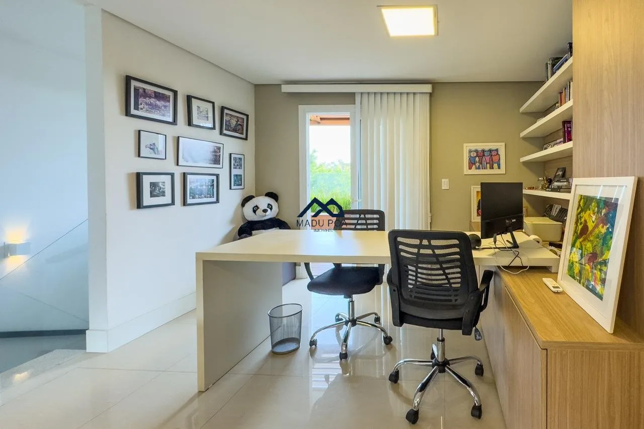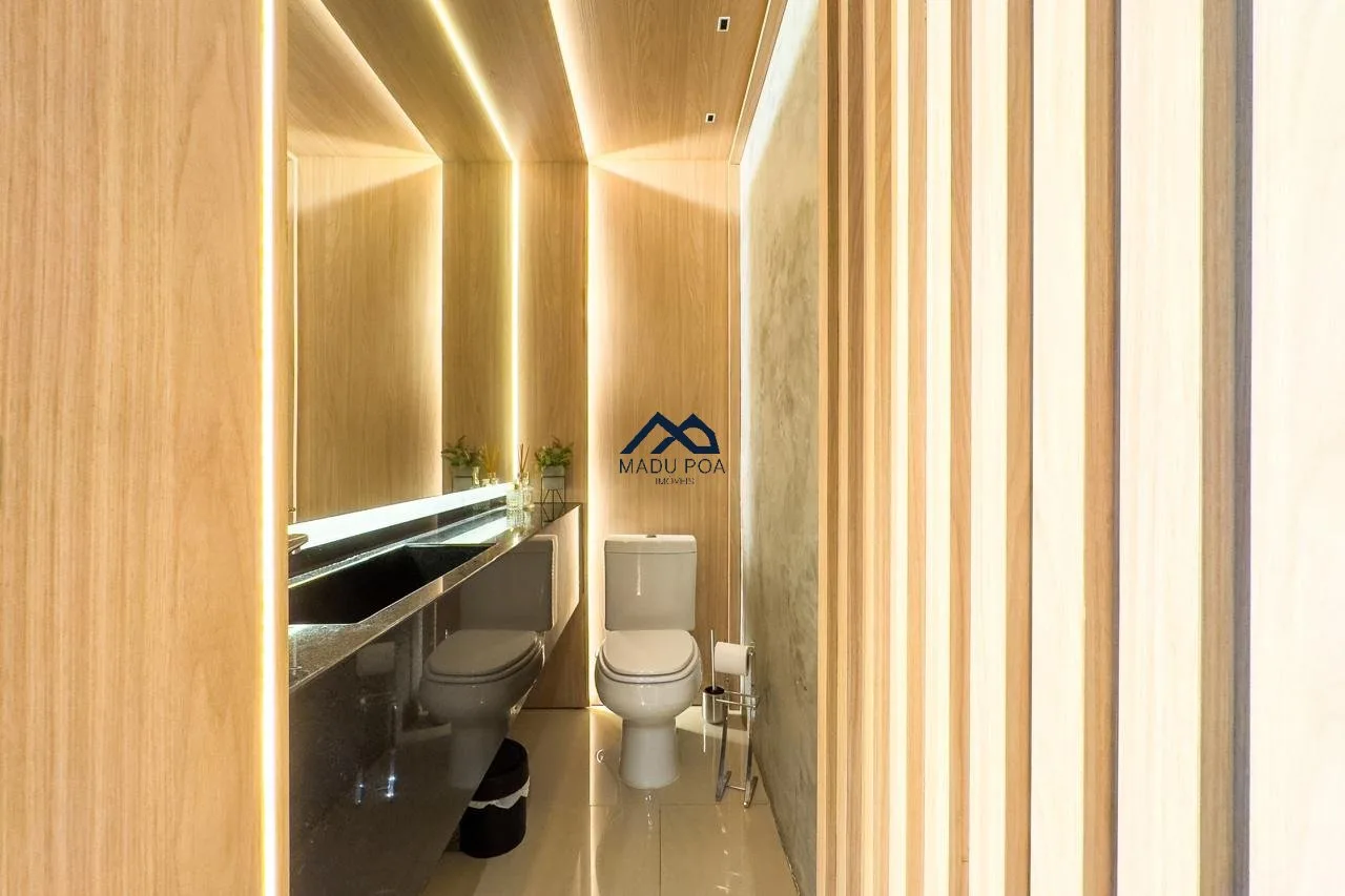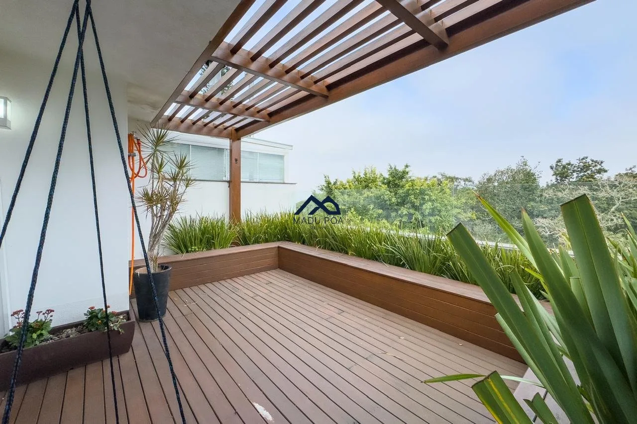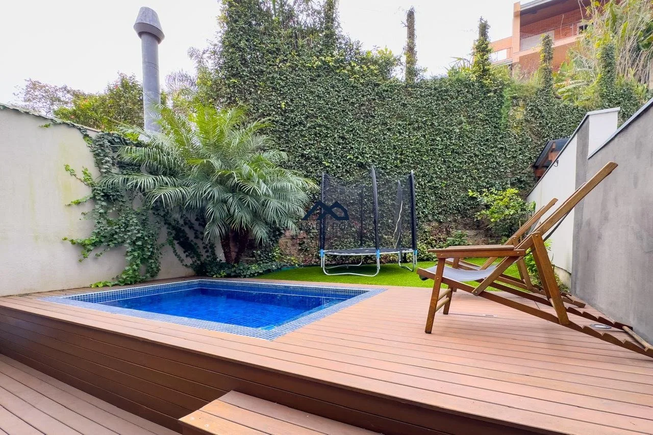 1ºPavimento: Living para dois ambientes, sala de estar, sala de jantar, cozinha com móveis sob medida, churrasqueira, lavabo, lavanderia, garagem para dois carros cobertas e possibilidade de um terceiro descoberto, além de piscina com deck.