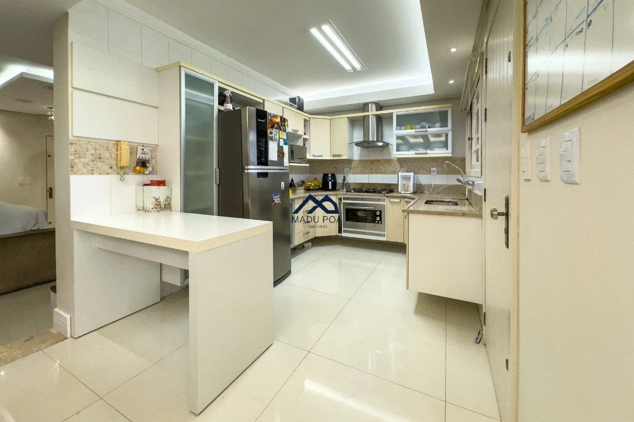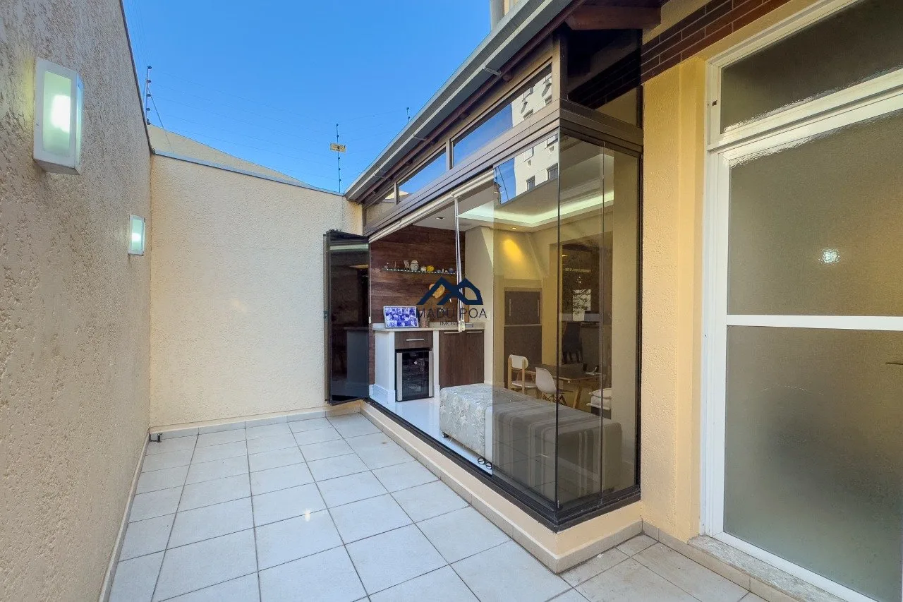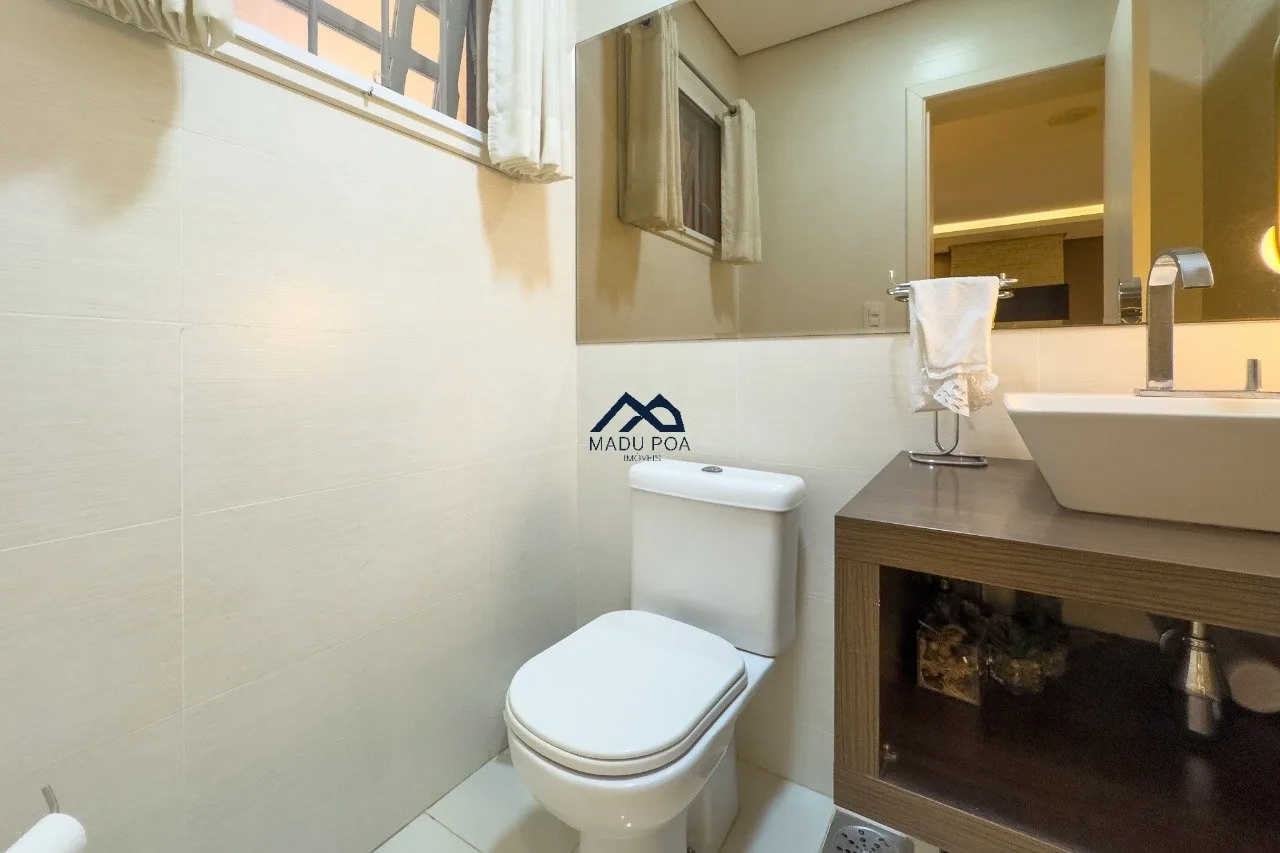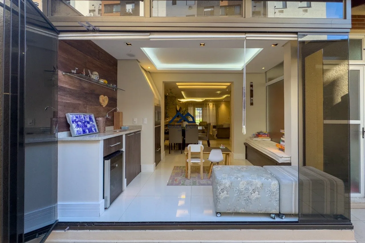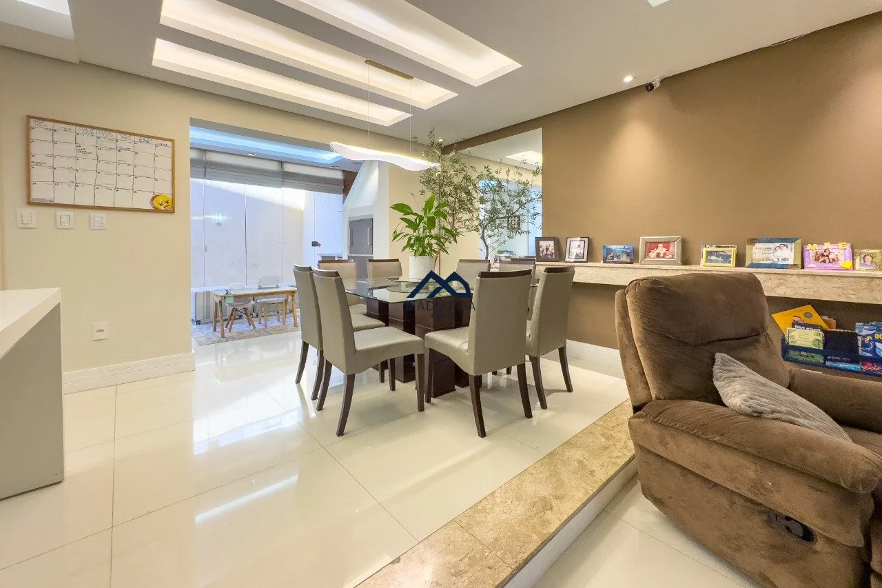 1ºPavimento: Living para dois ambientes com lareira, lavabo, espaço gourmet com churrasqueira, cozinha americana com móveis sob medida e área de serviço.