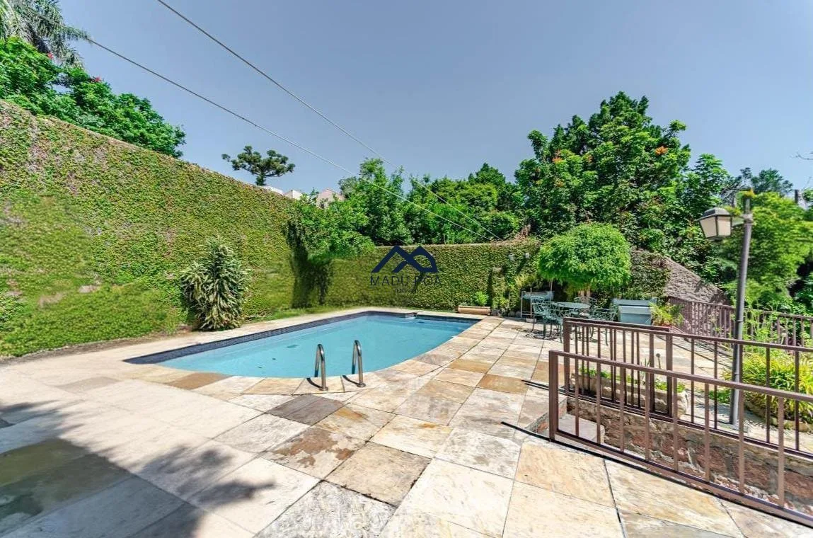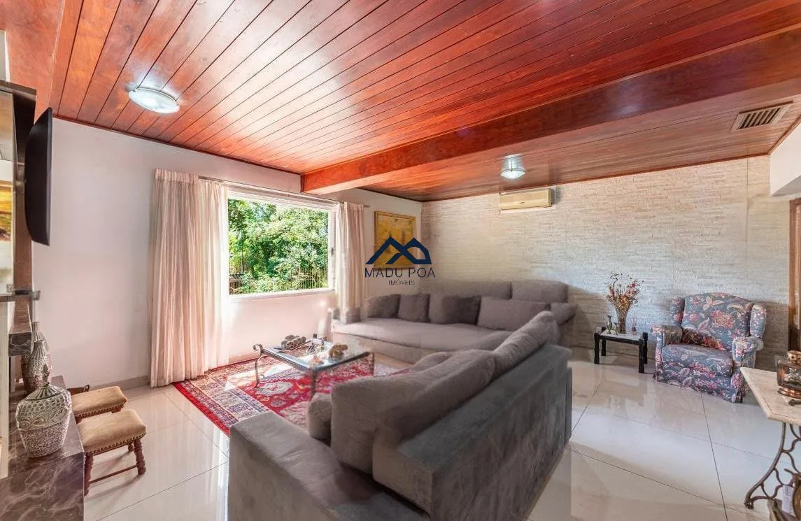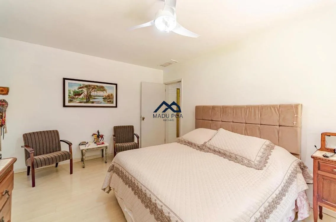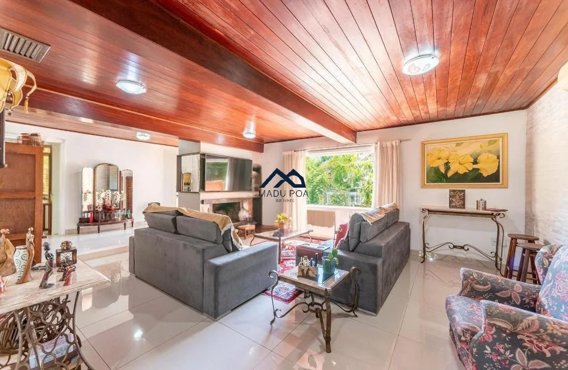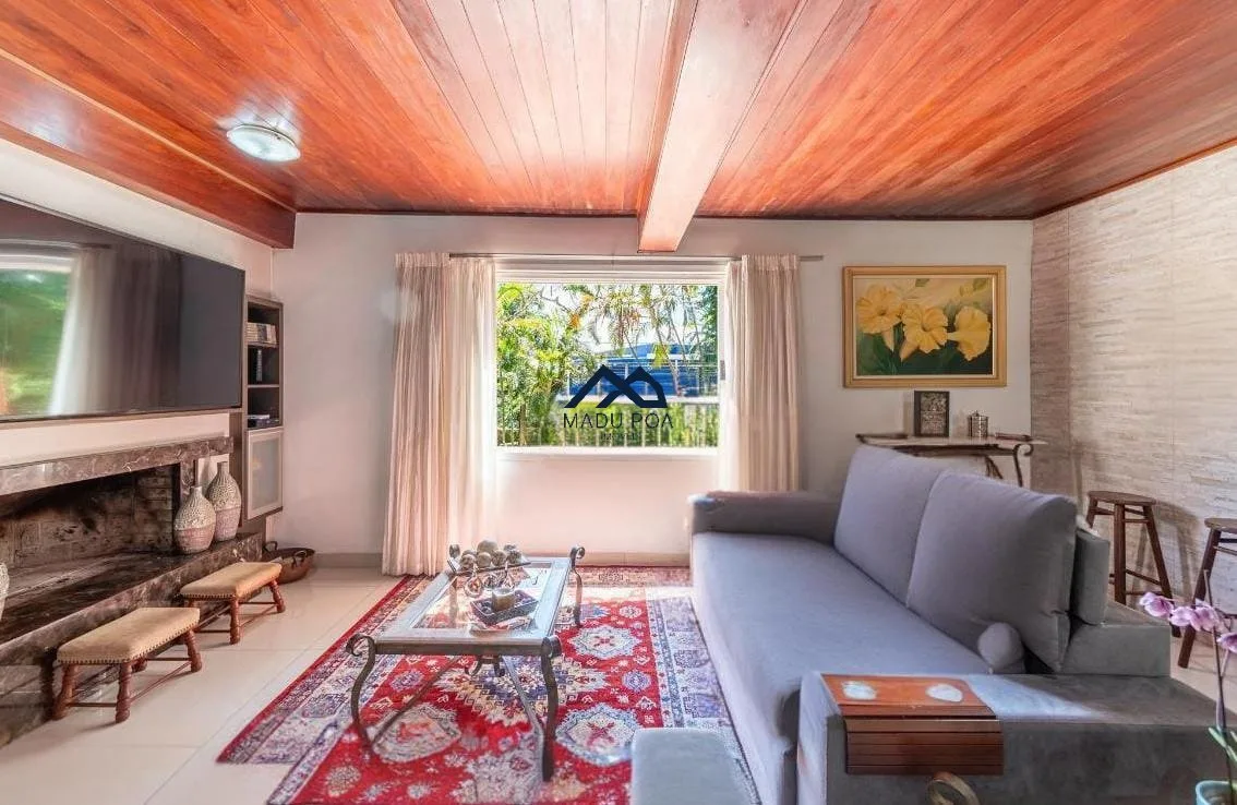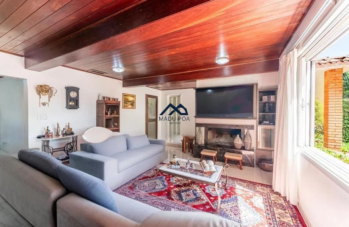 Living amplo com lareira, sala de estar e jantar, cozinha planejada, área de serviço, lavanderia separada, churrasqueira, pátio, piscina, jardim, duas vagas cobertas e duas descobertas.