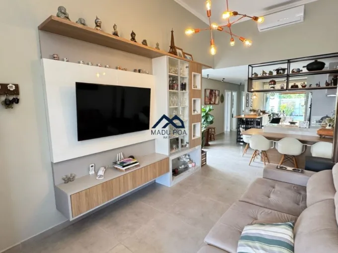 Living para dois ambientes com cozinha integrada, área Gourmet com churrasqueira e pátio. São três dormitórios, sendo uma suíte e banheiro social.