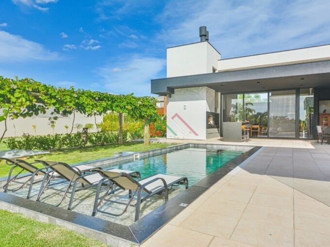 Imóvel possui irrigação automática (água do lago), sistema fotovoltaico com placas solares de alto rendimento, com linda piscina de alvenaria com prainha e iluminação interna e pergolado de pinus, garagem coberta, iluminação externa de jardim, pegolado de vidro na varanda externa dos fundos, churrasqueira em concreto aparente com utensílios em inox, forno de pizza em inox, lareira de alta eficiência.