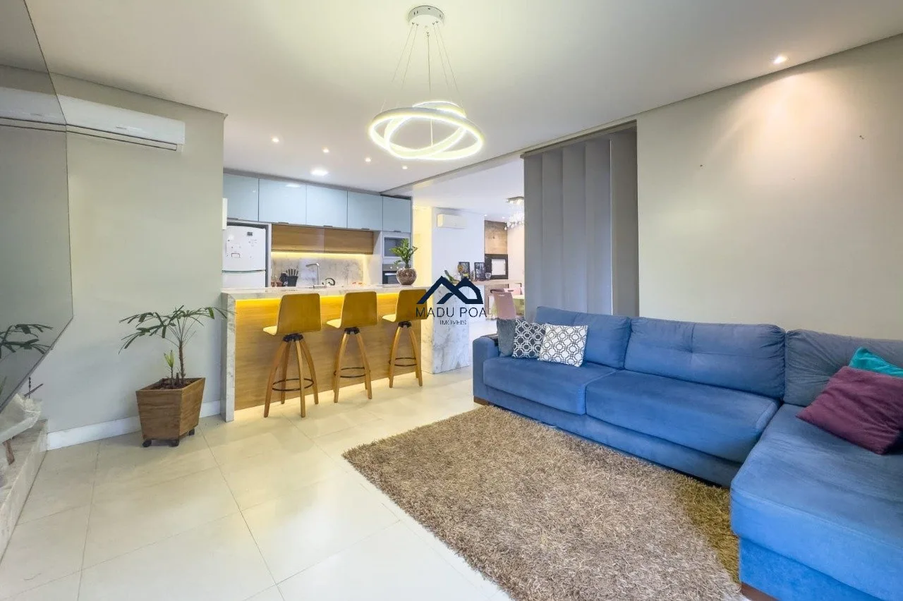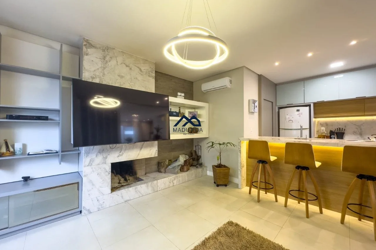 Amplo living com móveis planejados, lareira, lavabo, cozinha em conceito aberto, espaço gourmet com churrasqueira, pátio e lavanderia separada.