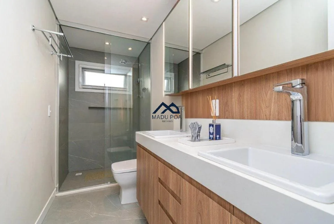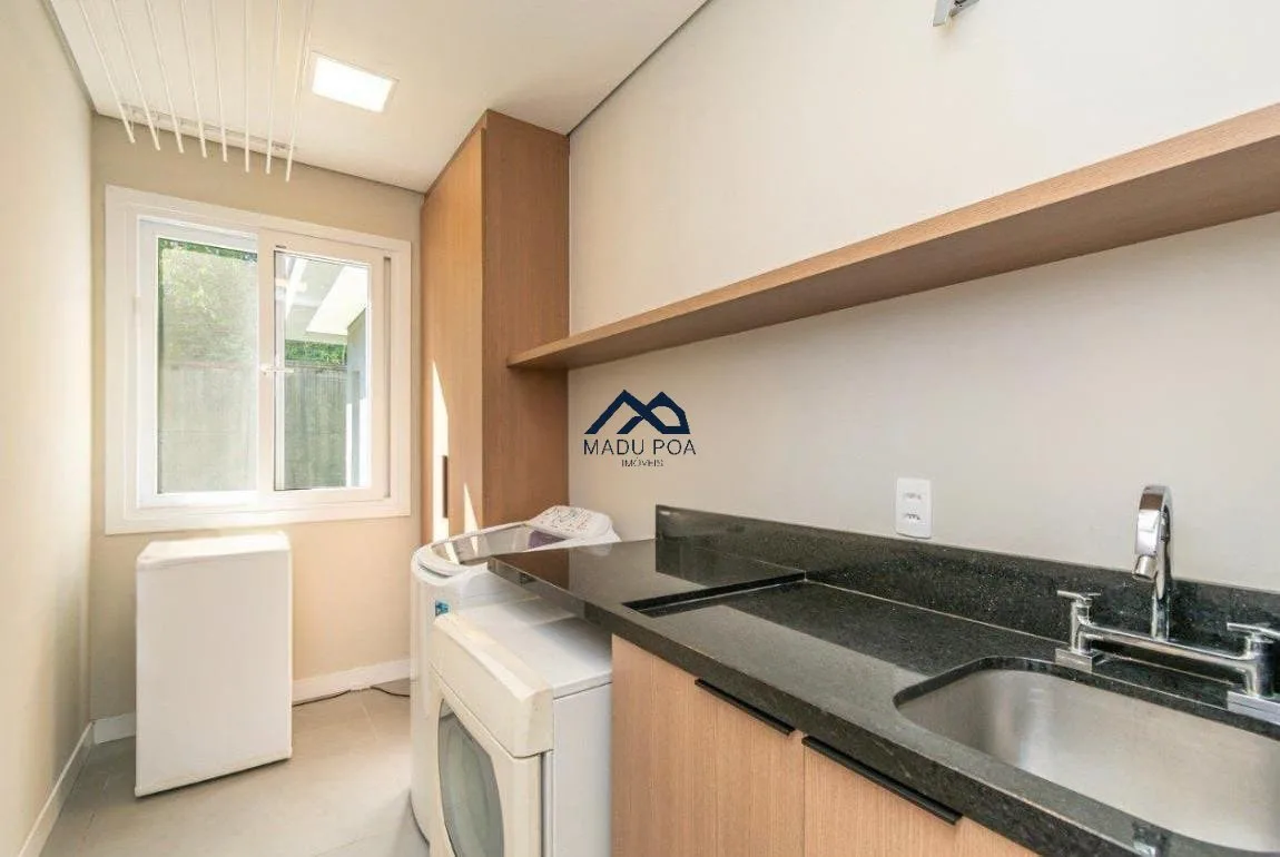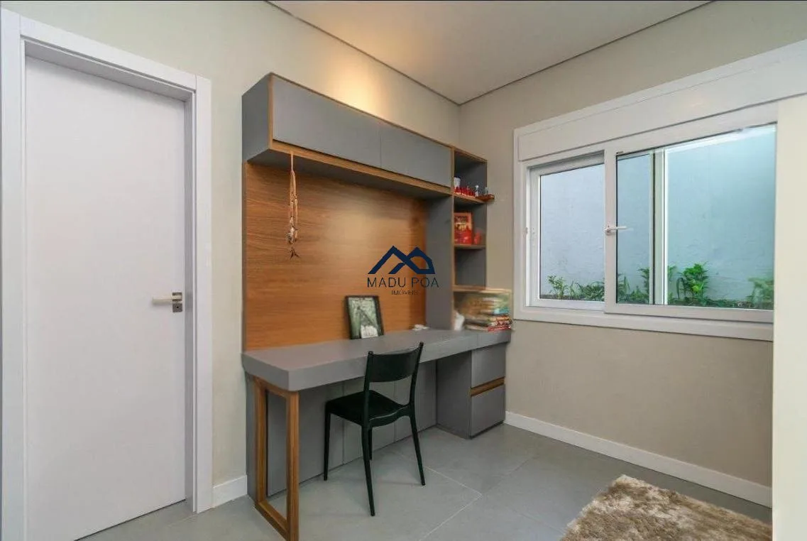 Living para dois ambientes com lareira, lavabo, cozinha americana com churrasqueira, escritório, lavanderia, depósito, banheiro e amplo pátio com área verde.