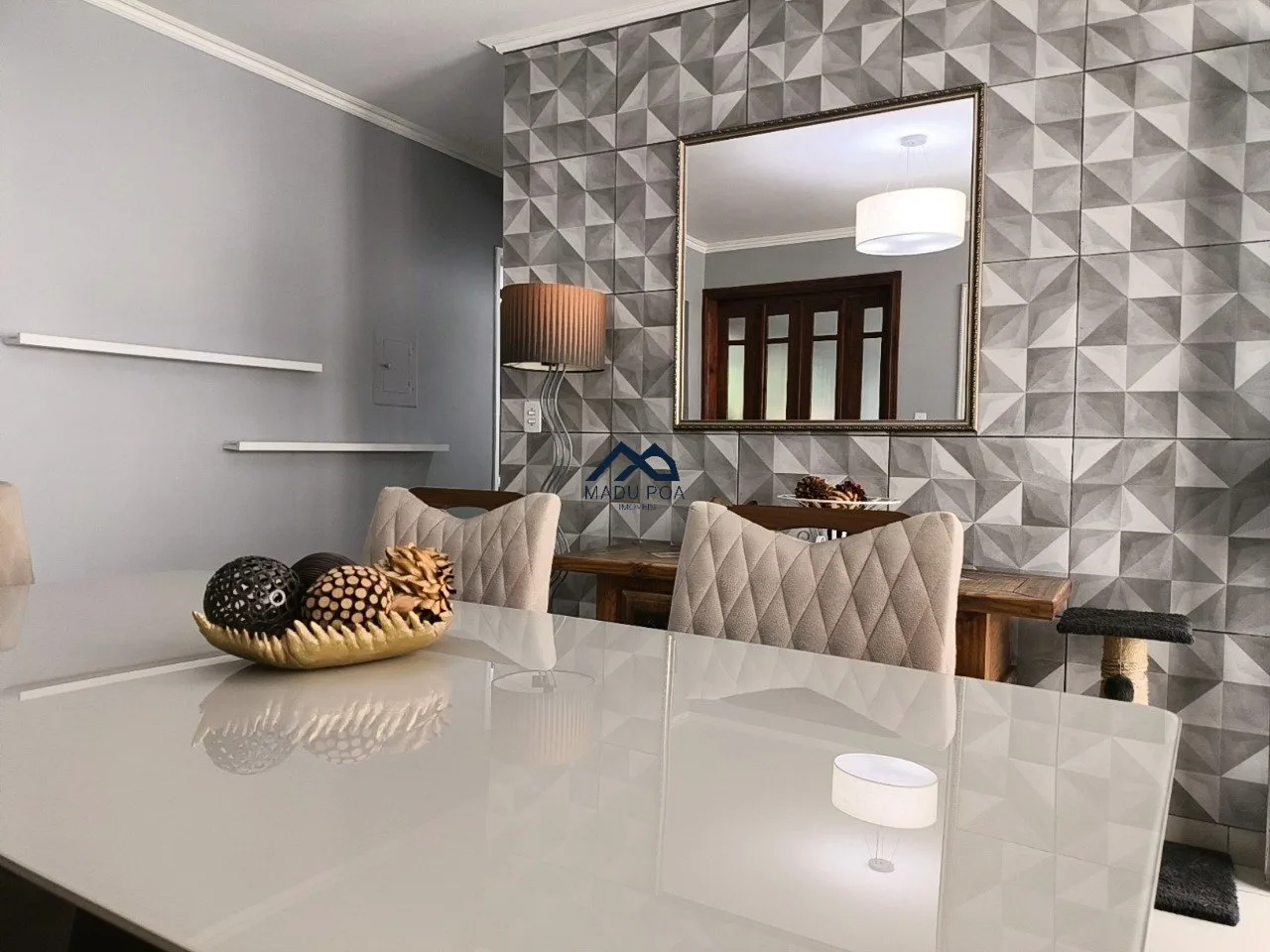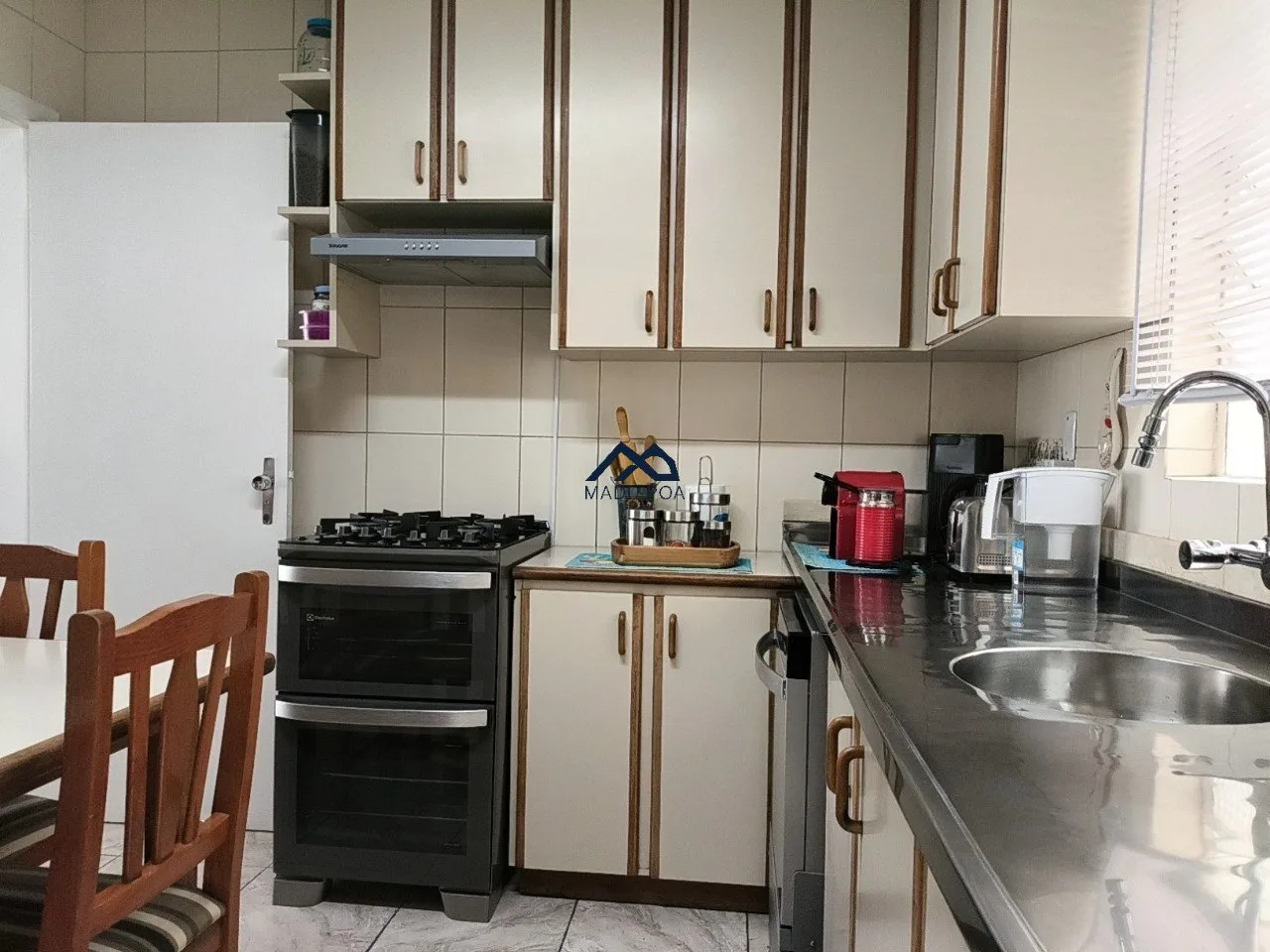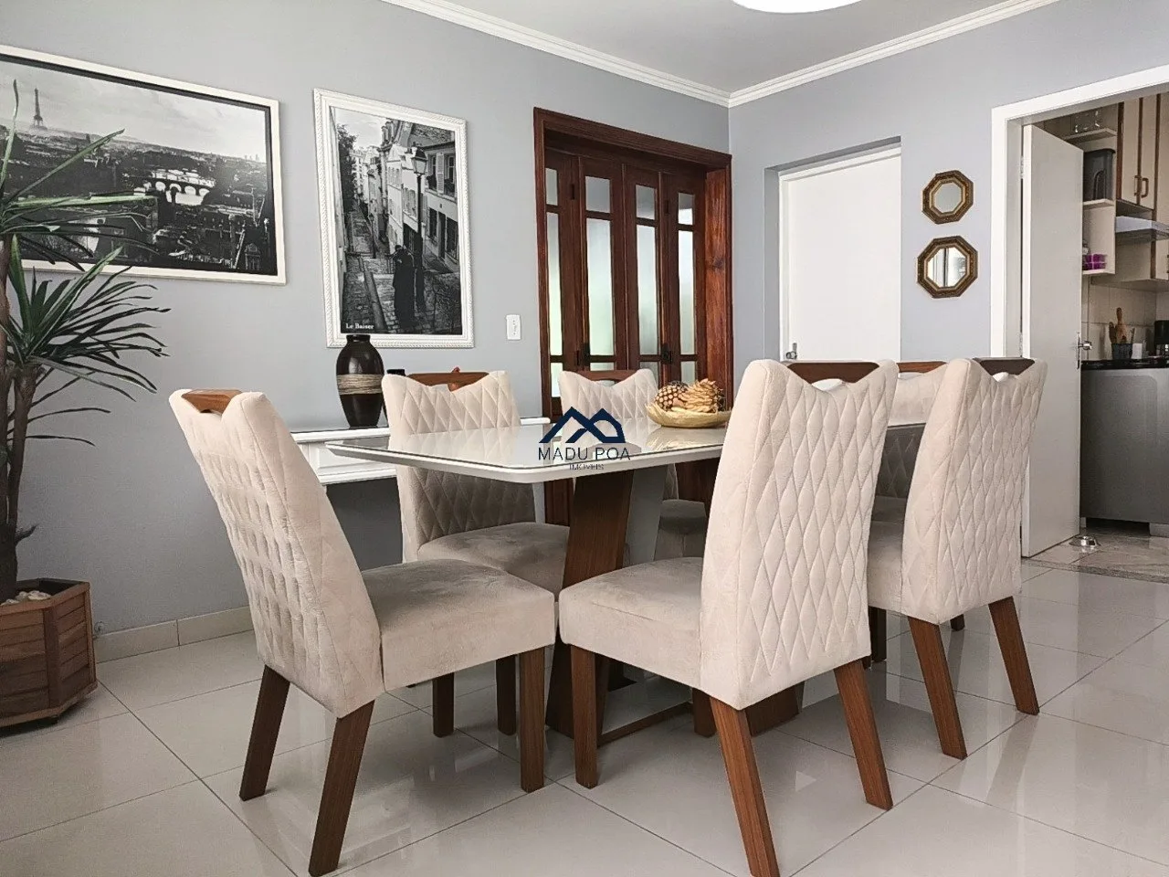 Living para dois ambientes, sala de jantar, cozinha planejada e pequena área de serviço.