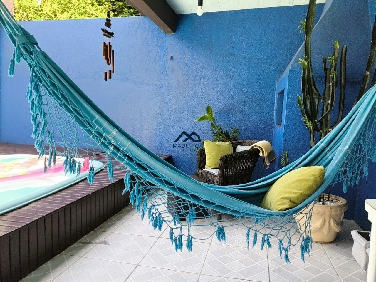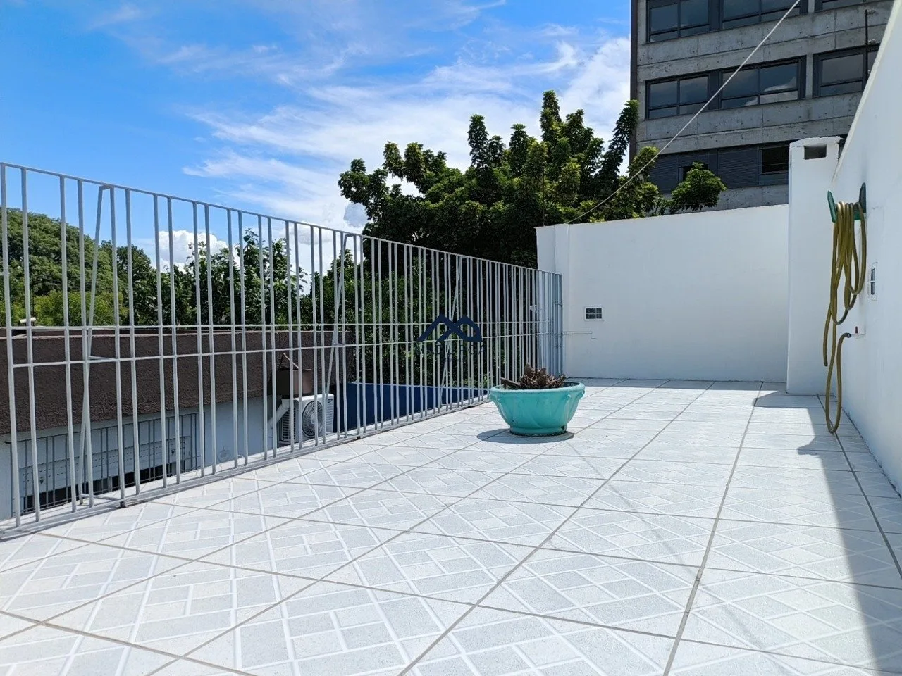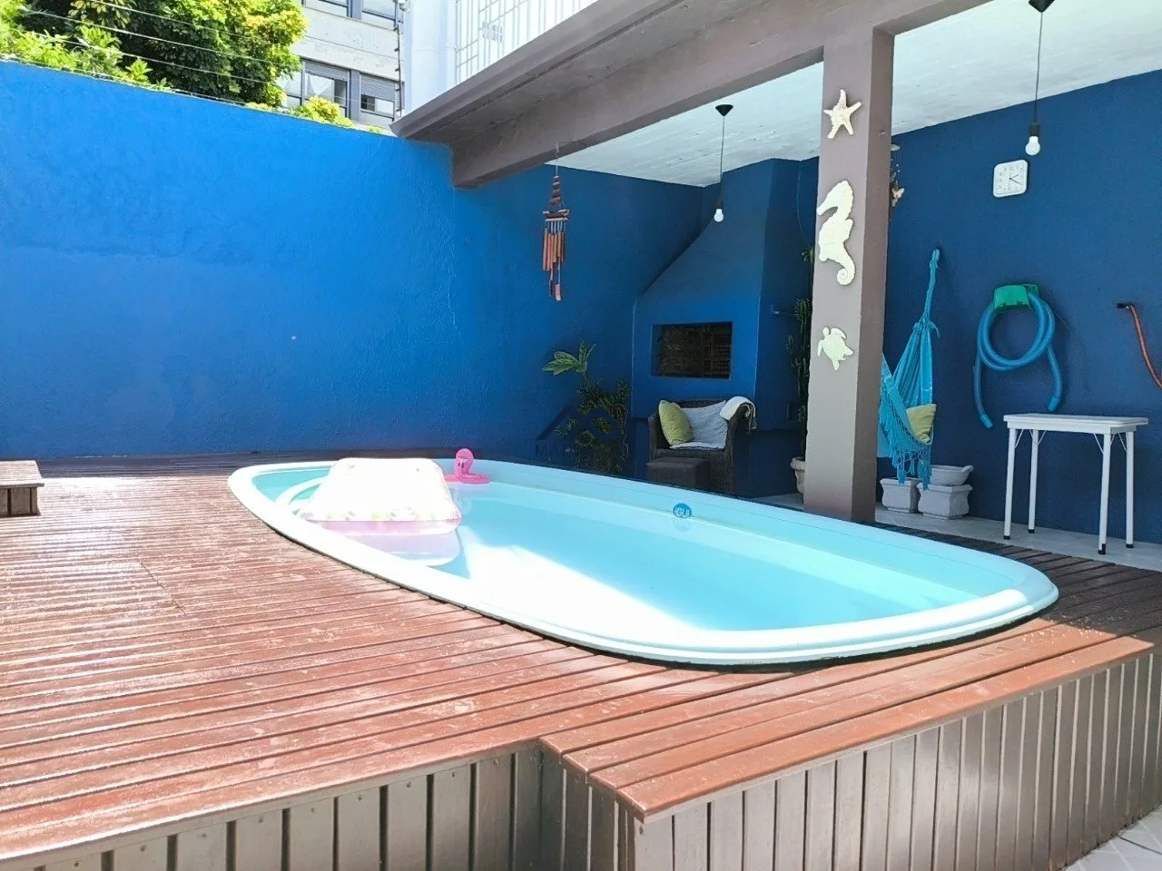 Pátio com piscina, churrasqueira e um terraço com vista panorâmica.