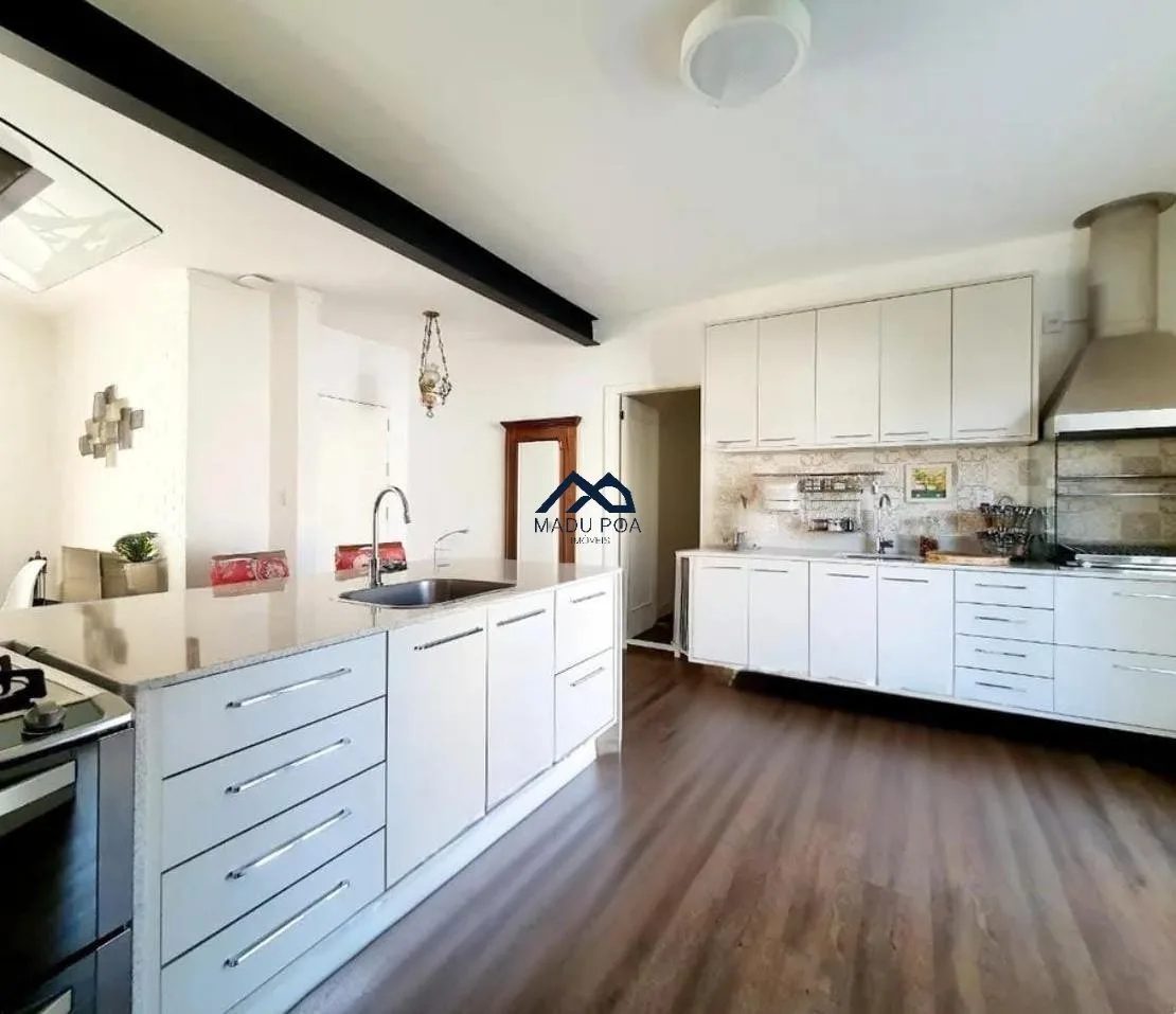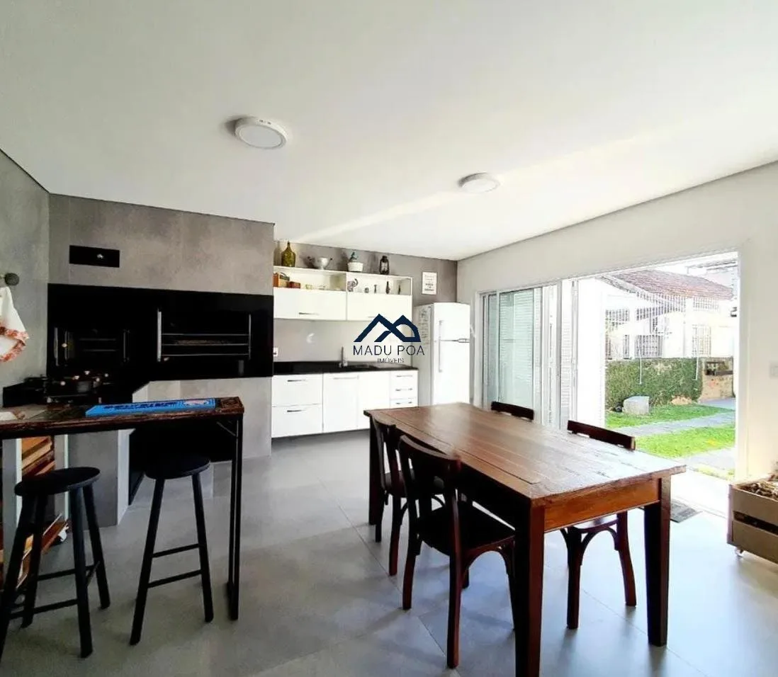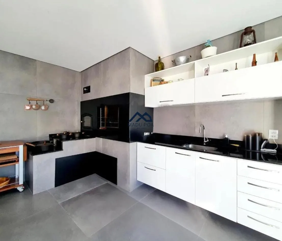 Living para dois ambientes com lareira e cozinha planejada em conceito aberto, lavanderia separada, área gourmet com churrasqueira, fogão campeiro, forno a lenha, salão de festas, despensa (com opção de ser mais um dormitório), amplo pátio com piscina, horta, árvores frutíferas e garagem fechada para três carros.