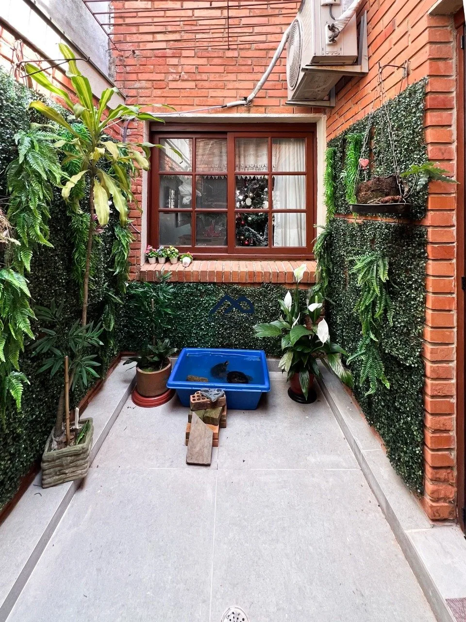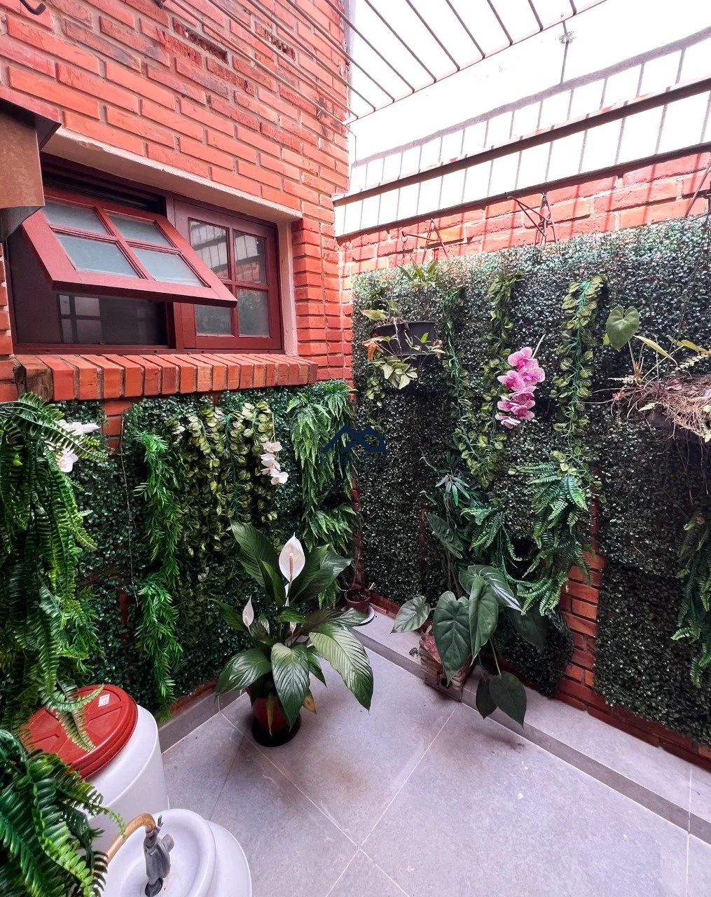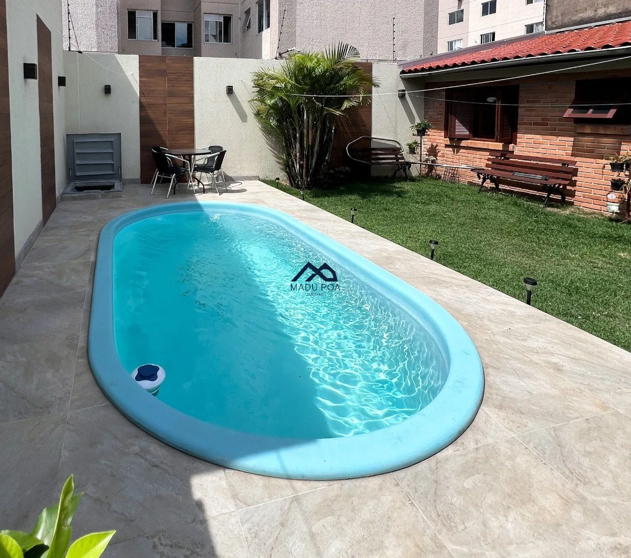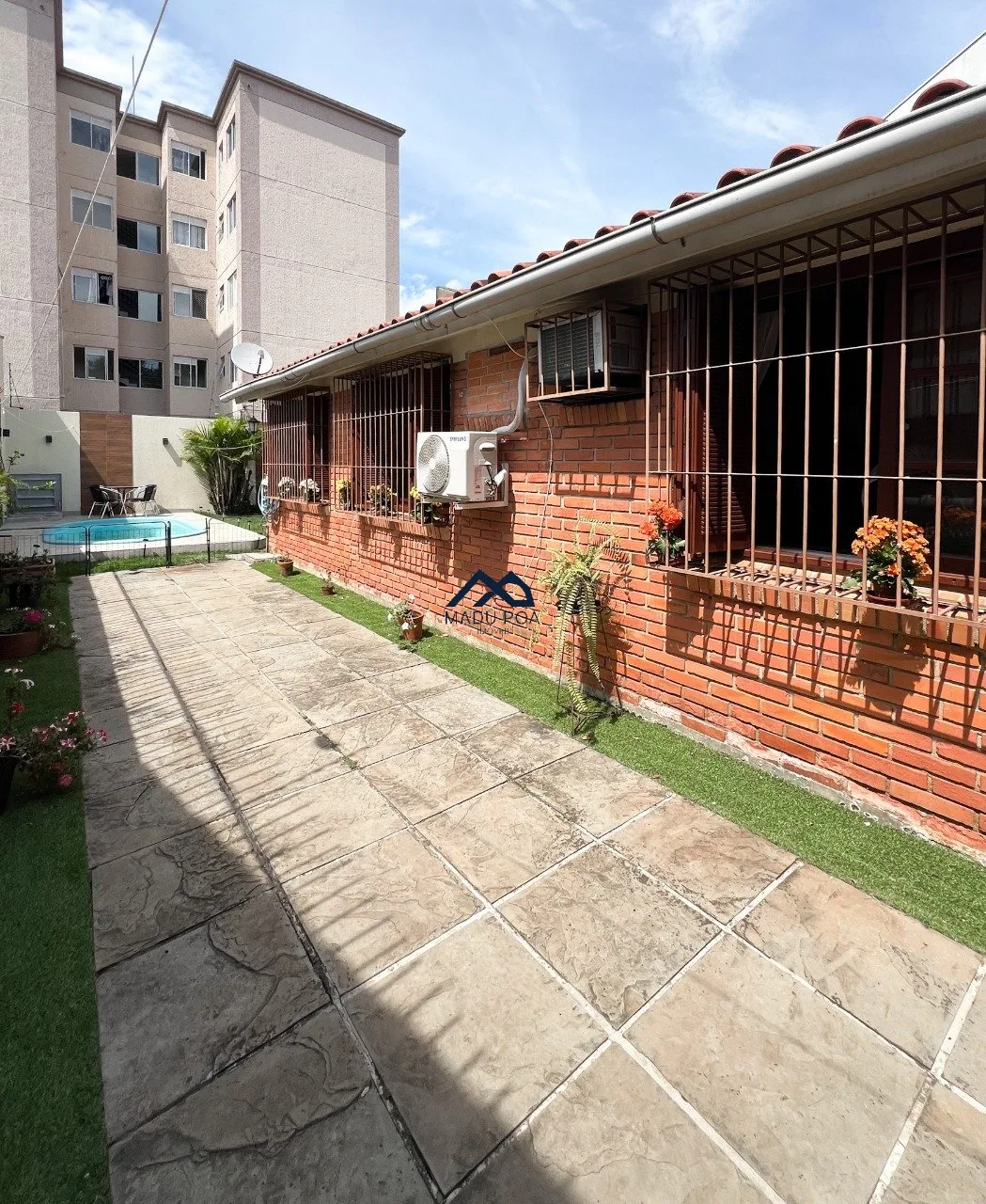 Pátio de boa extensão com gramado.