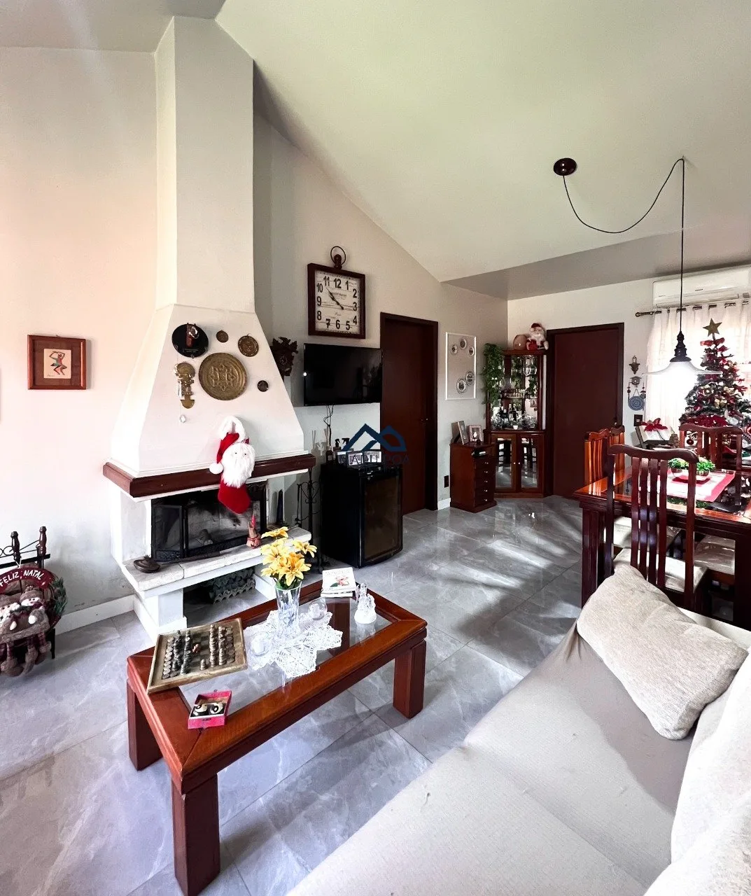 Ampla copa cozinha, living com banheiro social, varanda com área de serviço e churrasqueira.