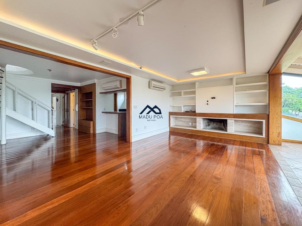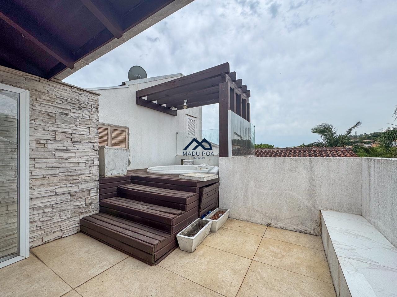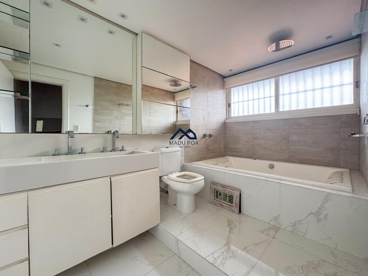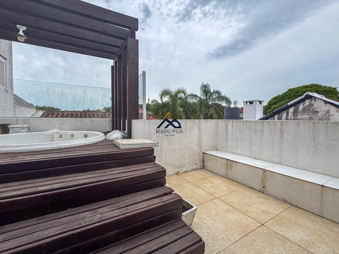 No andar superior: lareira, churrasqueira, adega, banheiro, vista para o rio Guaíba, terraço com uma banheira de hidromassagem.