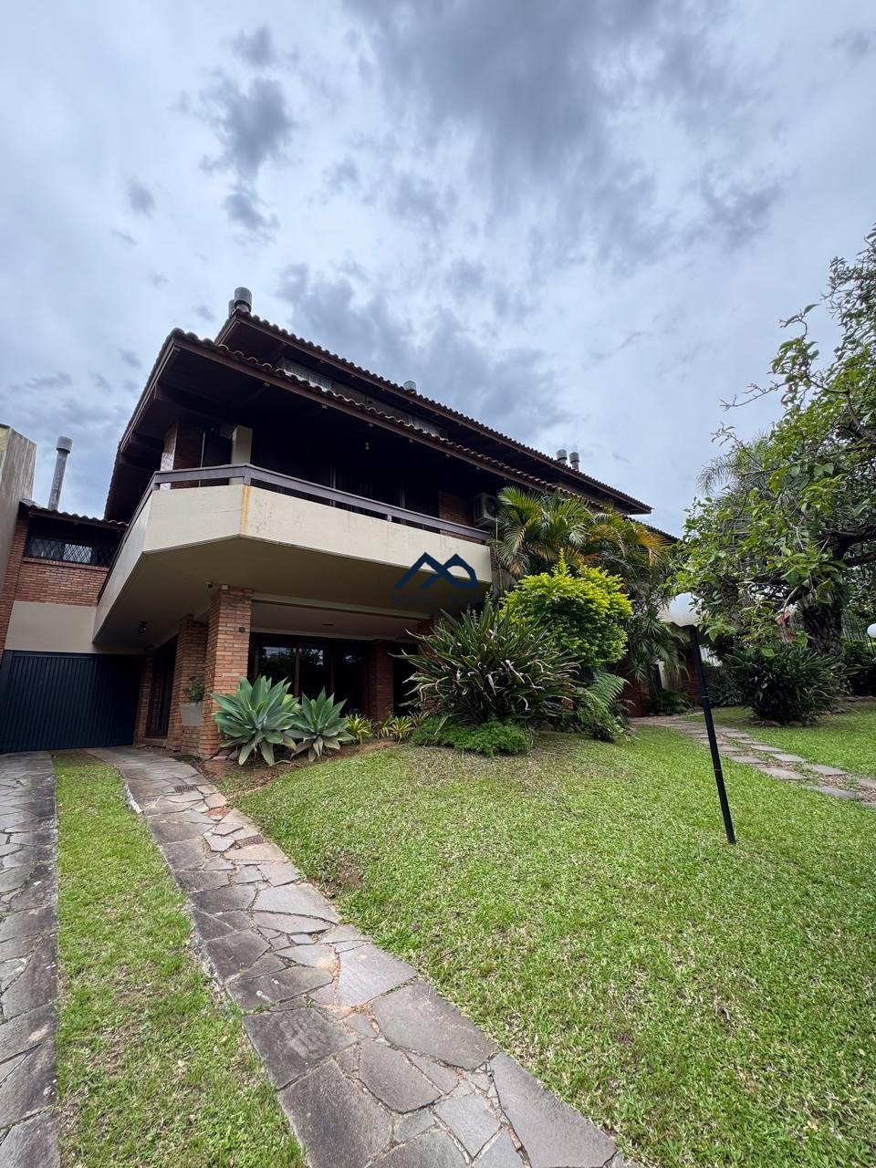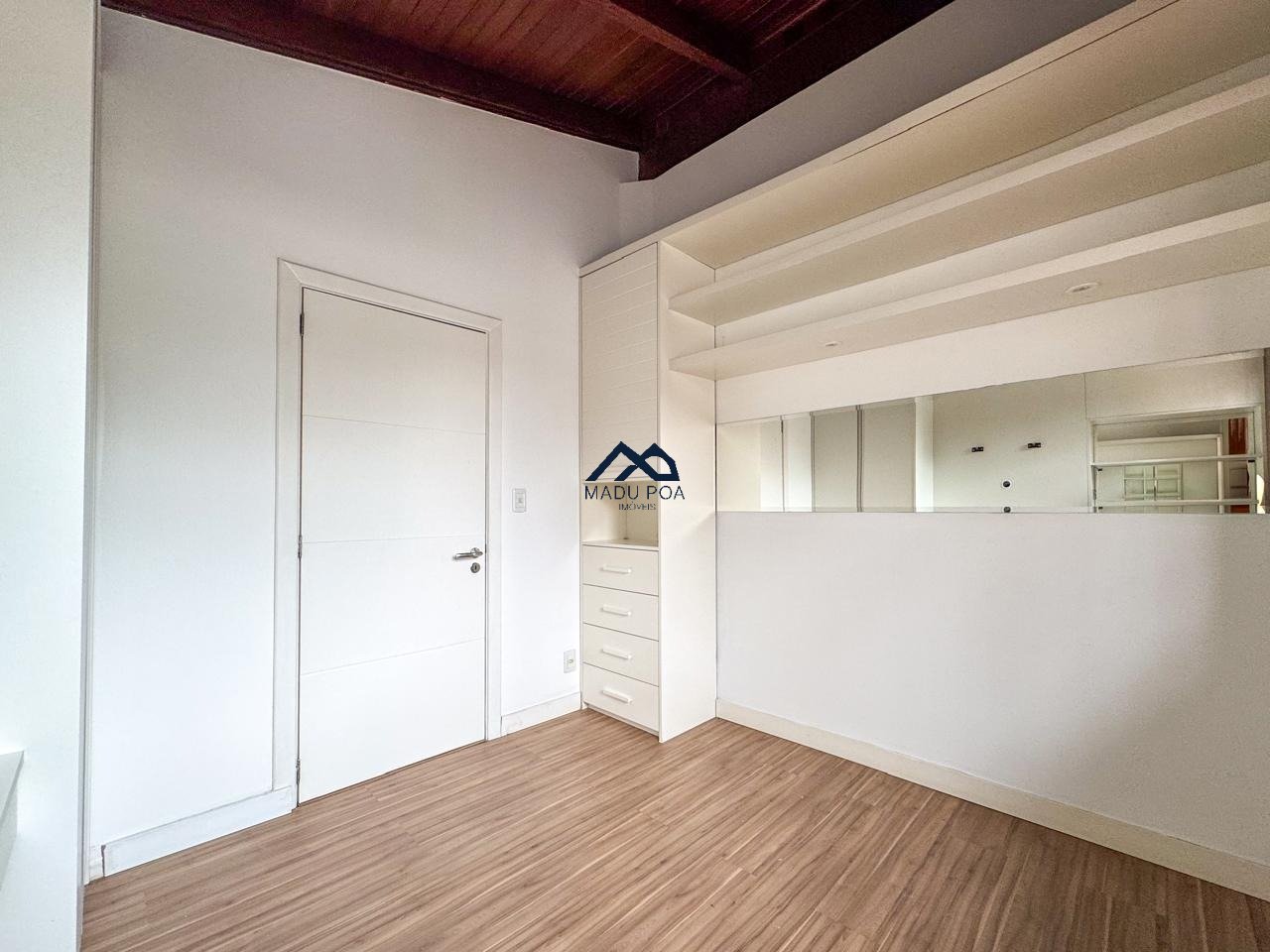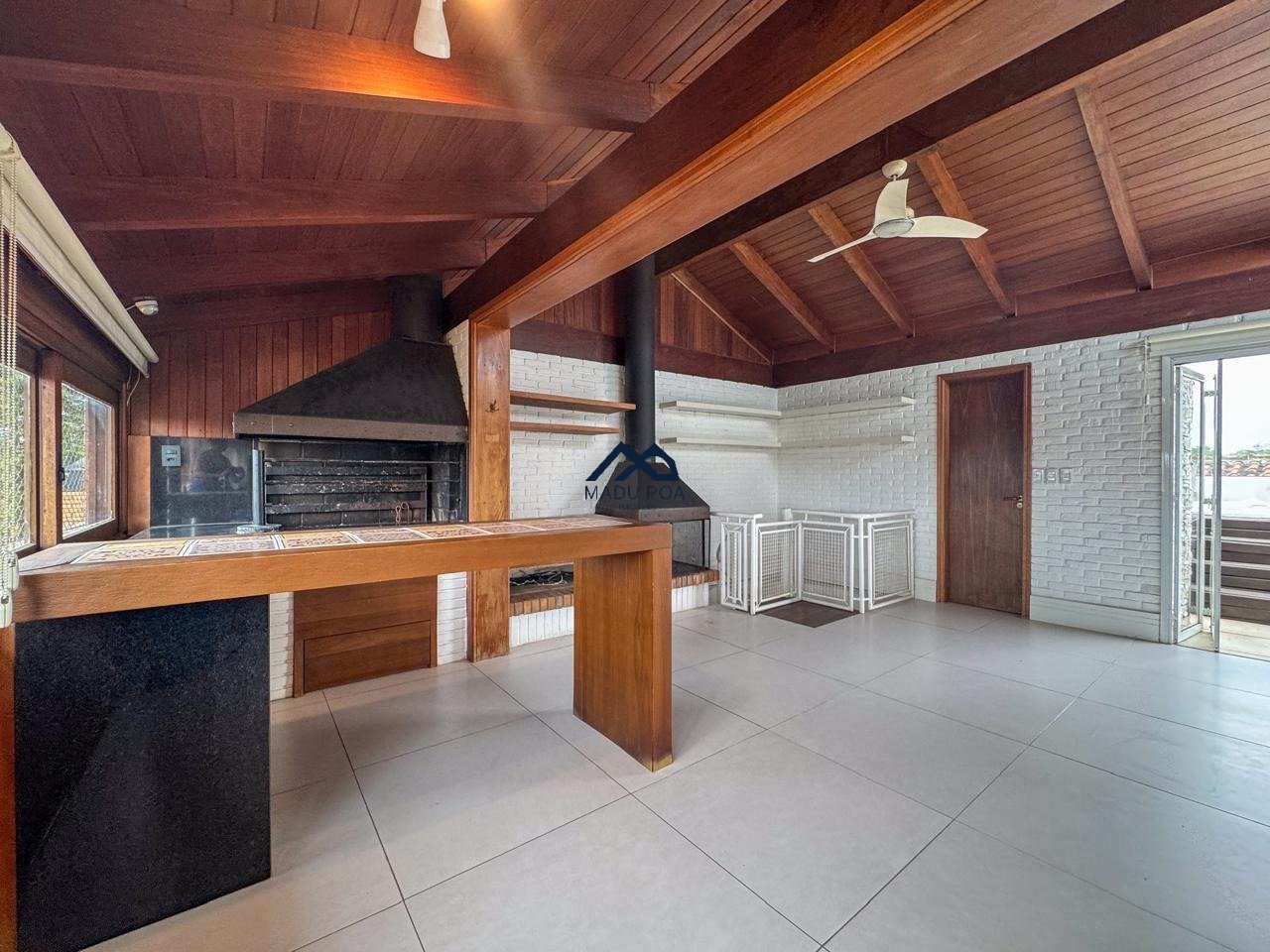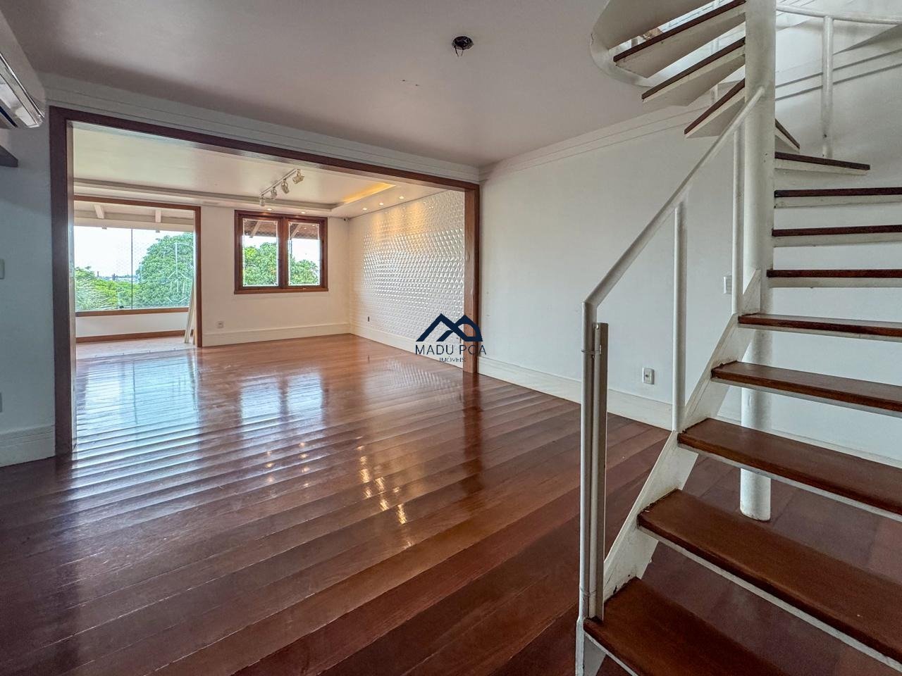 No andar superior: lareira, churrasqueira, adega, banheiro, vista para o rio Guaíba, terraço com uma banheira de hidromassagem.