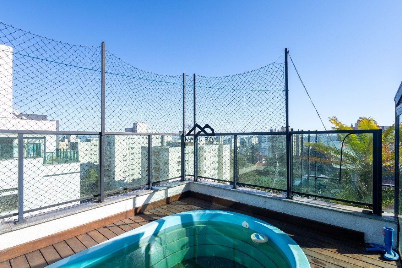Cobertura com amplo living para dois ambientes com lareira, deck com piscina, 3 dormitórios sendo 1 suítes banheiro social, cozinha americana com móveis planejados, churrasqueira, área de serviço separada, 2 vagas de garagem cobertas, lado a lado, com depósito e escrituradas.