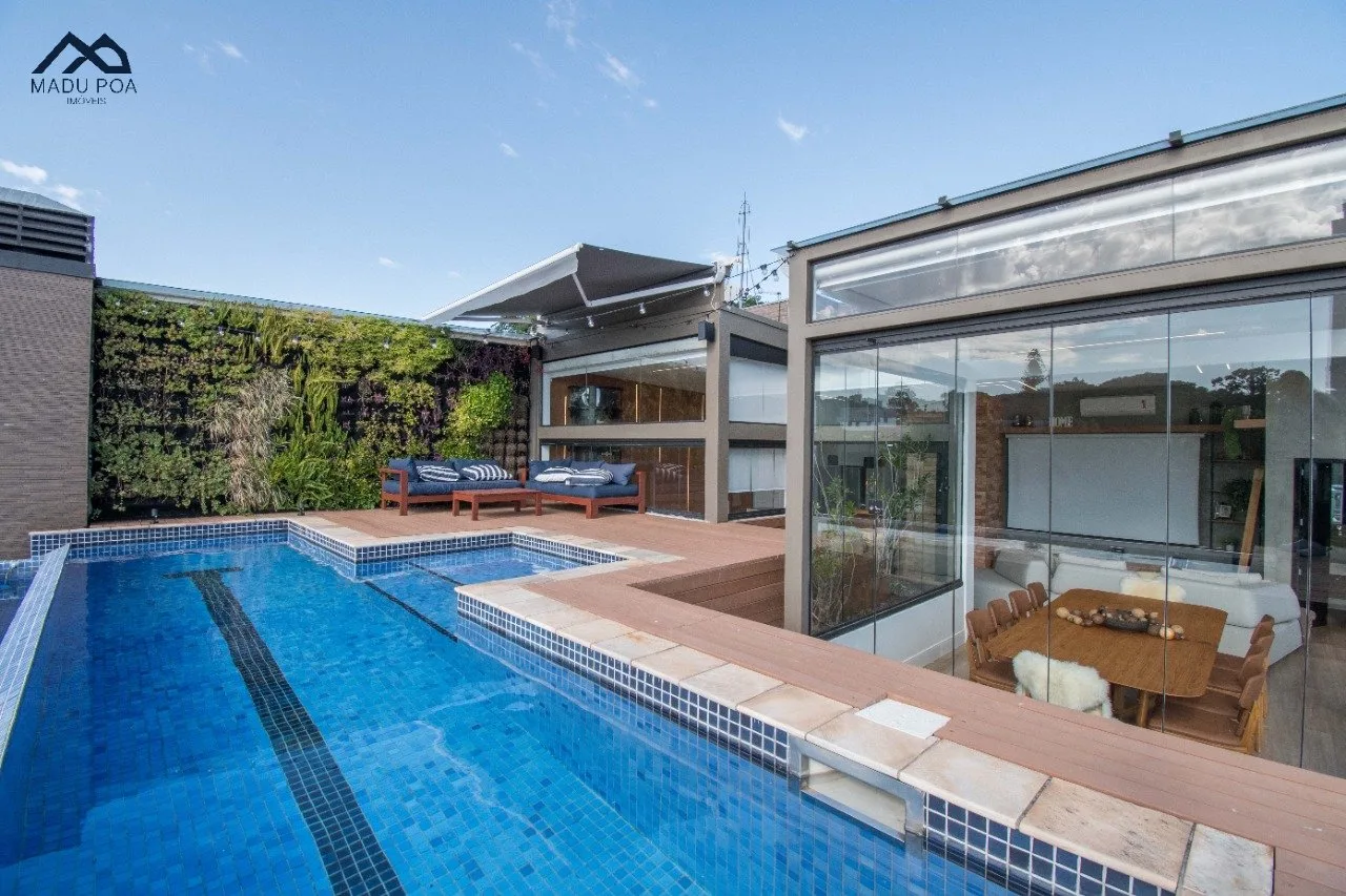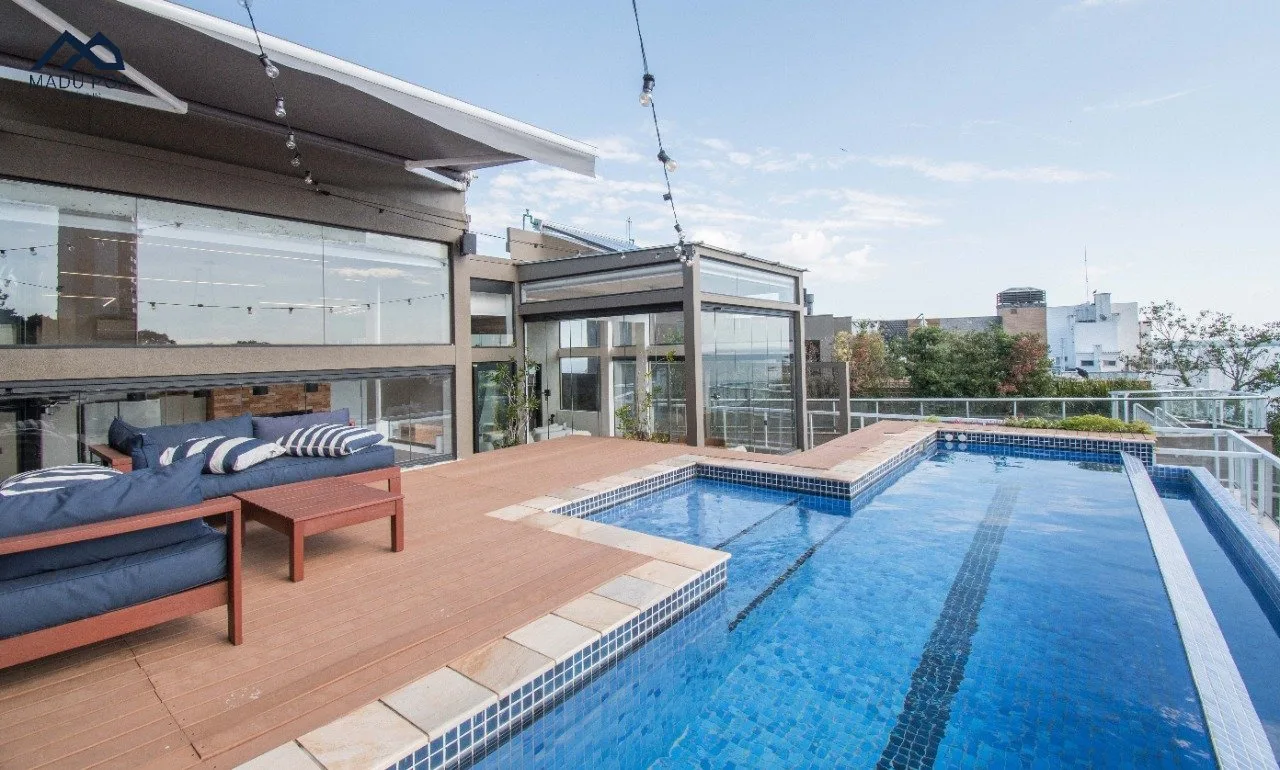 No andar superior possui espaço gourmet com churrasqueira, sala de estar, sala de jogos, banheiro social e amplo terraço com piscina de borda infinita e aquecida.