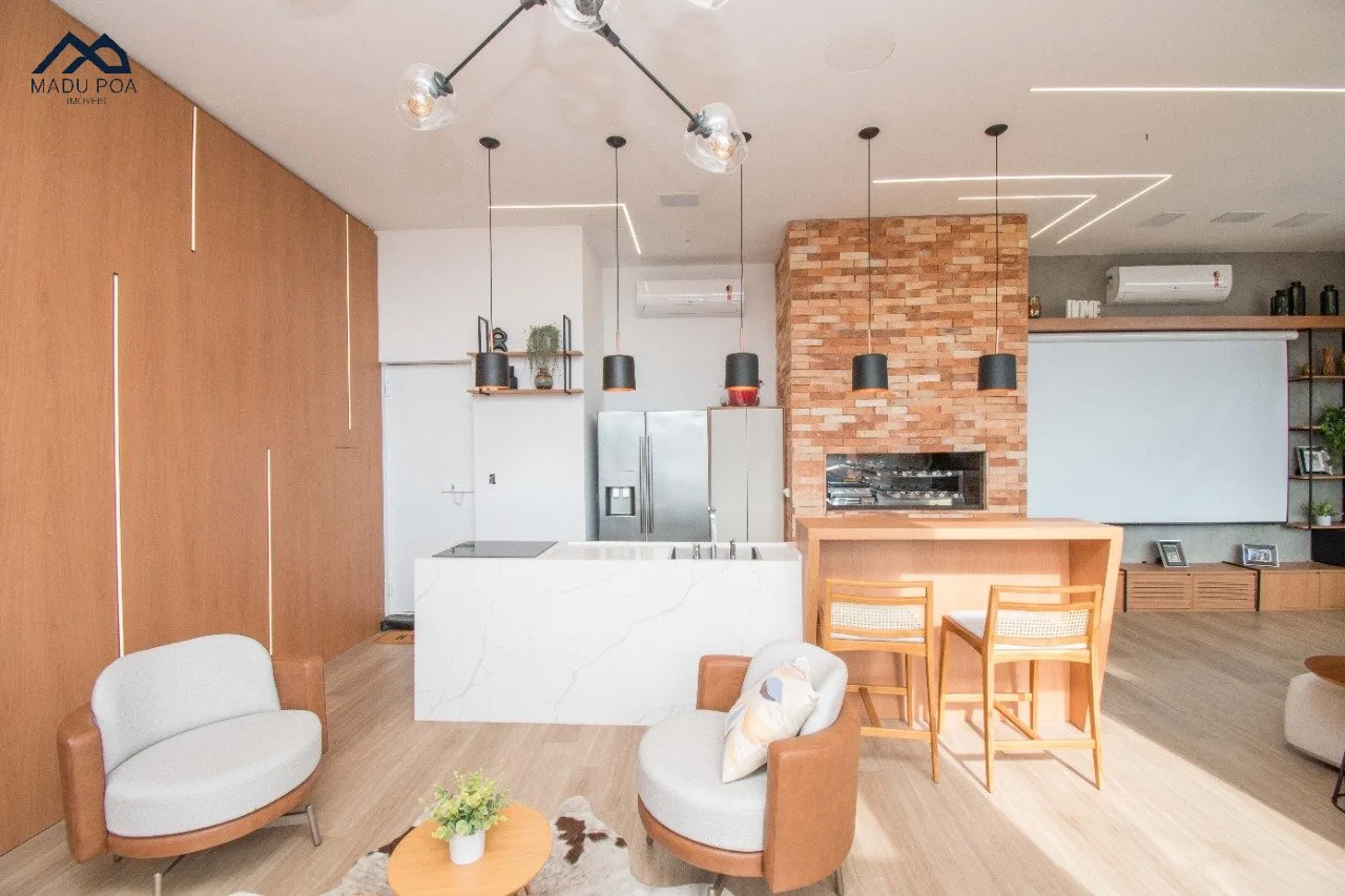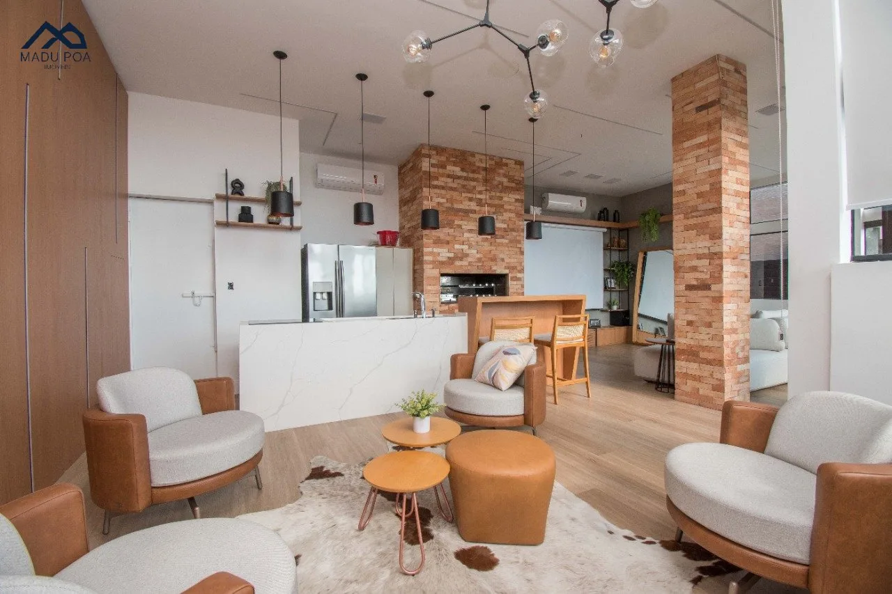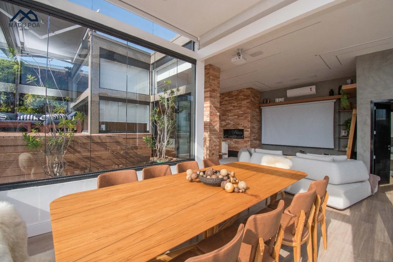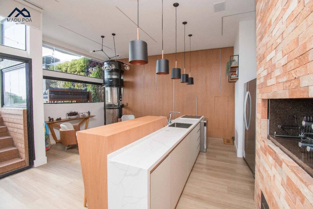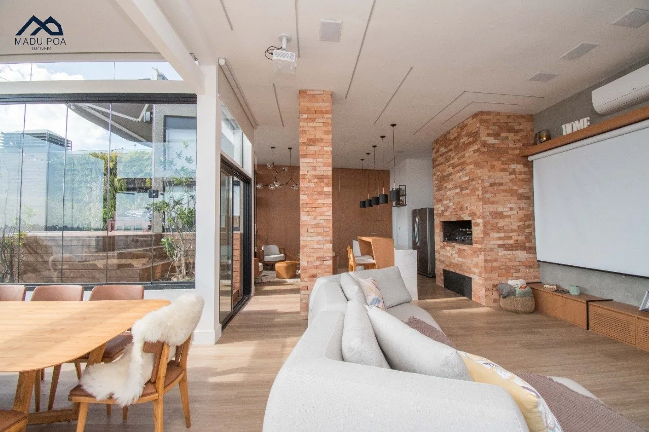 Possui living com 3 ambientes com lareira, varanda integrada e cozinha americana, lavabo, chapelaria, área de serviço e 03 suítes, sendo 01 delas master.